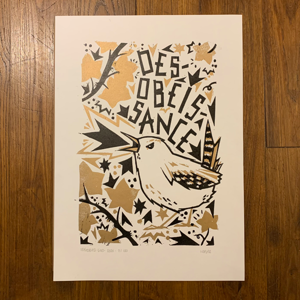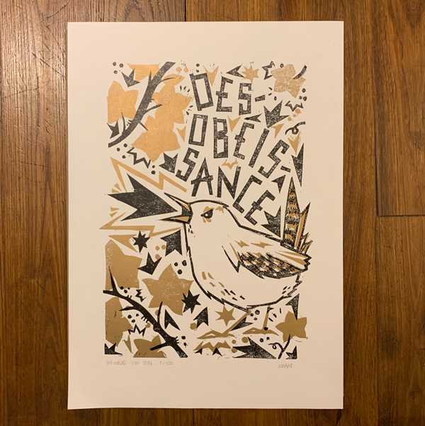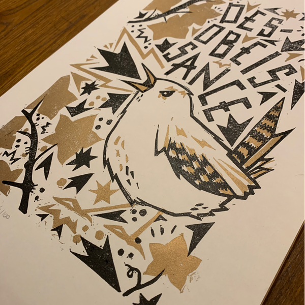 Tirage de linogravure en noir et doré à l’encre typographique